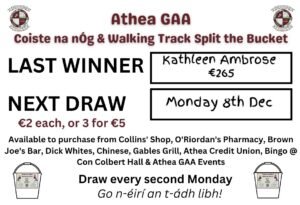 The last draw took place the 1st of December. The Lucky winner of €265 is Kathleen Ambrose Congratulations. The next draw will take place on Monday the 8th of December