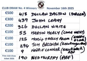 The last club draw took place Sunday the the 16th of November Congratulations to all the winners of our 4th draw. Thanks to everyone for supporting our annual fundraising draw. Our final club draw will take place Sunday the 7th of December.