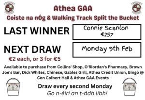 The tickets can be Purchased at Collins shop, Ger Whites bar, Brown Joes bar, Gables Grill, O’Riordans Pharmacy, Credit Union, Bingo Friday evenings and also online @ https://atheagaa.clubforce.com/products/draw/athea-gaa-draw