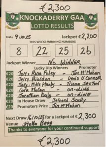 There was no winner of last week’s lotto jackpot of €2,200. Congratulations to all who won prizes on the night. Lotto Jackpot hits €2,300 this Thursday, Have you played?