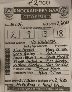 There was no winner of last week’s lotto jackpot. Congratulations to all who won prizes on the night, Knockaderry GAA Lotto Jackpot hits €2,700 tonight, Thursday, Have you played?