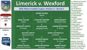 Jimmy Lee and his management team has announced their Limerick Senior Football team and match panel for their Rd 3 League game v Wexford: