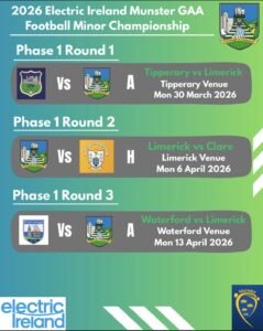 The Electric Ireland Munster GAA Football Minor Championship begins on Monday March 30th are Clare host Waterford while Limerick travel to play Tipperary in the first round of Phase 1. The Munster Minor Football Championship format will change this season and will adopt the same system as the Munster Under 20 Football Championship with the introduction of a Phase 2 Round-Robin Championship involving Kerry, Cork and the top two teams from Phase 1. As defending Munster Minor Football champions, Kerry will open their campaign away to the 1st place in Phase 1 on Monday April 27th. The Munster Minor Football Final is panelled in for Monday May 18th.