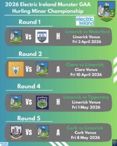 The Electric Ireland Munster GAA Hurling Minor Championship will get underway on Friday April 3rd with Limerick hosting Waterford while Clare travel to play Tipperary. The defending Munster Minor Hurling champions Cork will enter the fray in Round 2 on Friday April 10th with a trip to take on the defending All-Ireland Minor Hurling champions Waterford. The Munster Minor Hurling Final will take place on Friday May 15th.